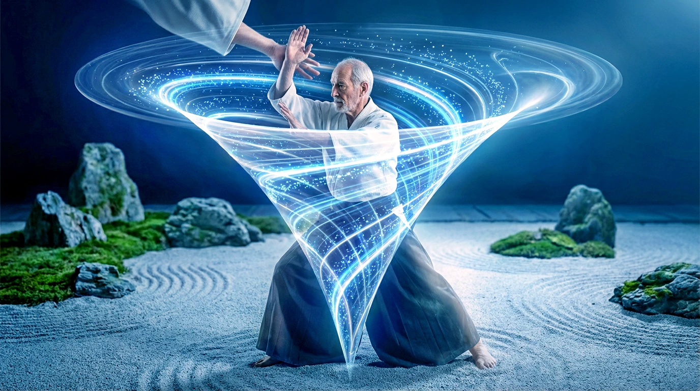 - Irimi nage : Le pratiquant entre dans l’attaque, capte la force linéaire et la transforme en mouvement circulaire autour de son centre, créant un moment qui projette aïté.