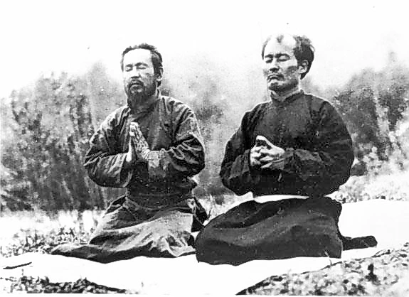 Masumi Matsumura and Morihei Ueshiba en train de pratiquer Chinkon Kishin (鎮魂帰神)